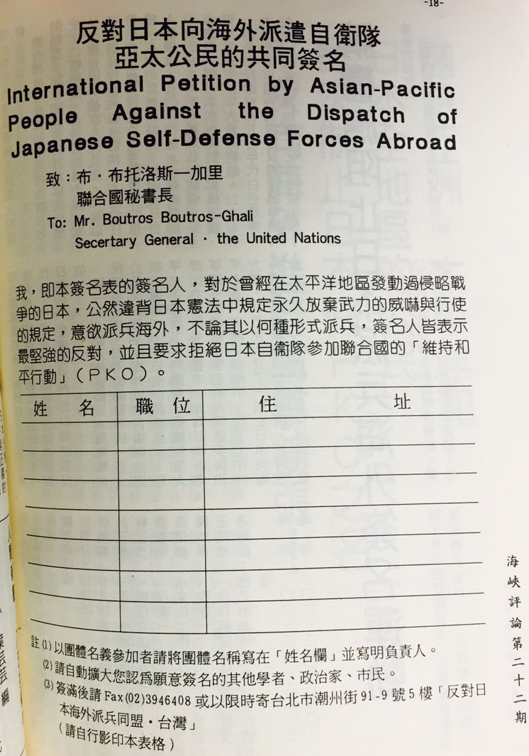 最近,日本著名的環境運動家、進步的評論家和報導作家廣瀨隆(Hirose Takashi)代表「亞洲公民阻止日本向海外派遣自衛隊會議.日本分會」,來函向台灣崇尚進步、和平與正義各界呼籲,在共同團結反對日本對海外派兵的基礎上,超越黨派、國界,以個人或團體名義,簽署參與和支援此一全亞洲範圍的反戰.和平運動,讓為了反對一切形式的帝國主義而奮鬥的亞洲鄰人,也充分認識到在這次反對日本假借PKO而向亞洲軍事擴張上,台灣人民同他們有共同的憤怒。